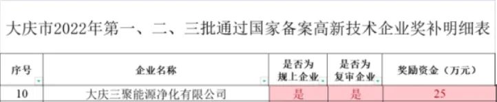根據(jù)《中共黑龍江省委辦公廳 黑龍江省人民政府辦公廳關(guān)于印發(fā)<新時代龍江人才振興60條>的通知》文件精神,大慶市科學技術(shù)局近日將大慶市2022年第一、二、三批通過國家備案的高新技術(shù)企業(yè)獎補名單及獎補金額予以公示。海國投旗下海新能科所屬企業(yè)大慶三聚公司獲得25萬元獎補資金。