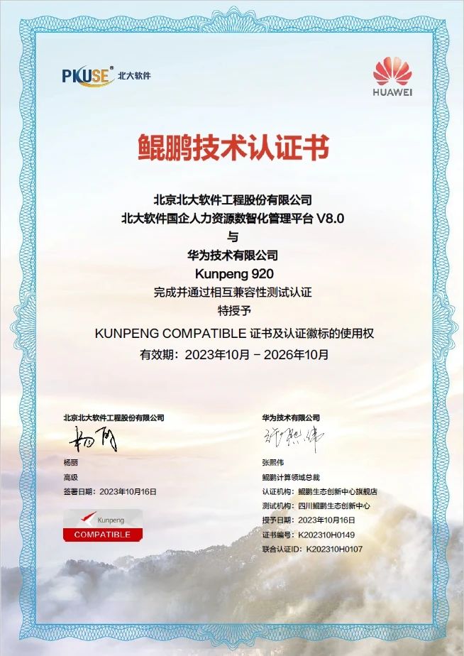 近日,北京北大軟件工程股份有限公司(以下簡(jiǎn)稱“北大軟件”)和華為技術(shù)有限公司(以下簡(jiǎn)稱“華為”)完成并通過(guò)了相互兼容性測(cè)試互認(rèn)證。北大軟件自主研發(fā)的國(guó)企人力資源數(shù)智化管理平臺(tái)V8.0(P8 DHR)順利通過(guò)的華為Kunpeng 920 CPU的相互兼容性測(cè)試,并獲得產(chǎn)品兼容性互認(rèn)證明證書(shū)。經(jīng)過(guò)嚴(yán)格的聯(lián)合測(cè)試驗(yàn)證,雙方產(chǎn)品兼容性良好,運(yùn)行穩(wěn)定、安全,可以滿足用戶的關(guān)鍵性應(yīng)用需求。