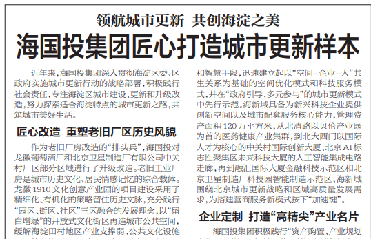 近年來,海國投集團深入貫徹海淀區(qū)委、區(qū)政府實施城市更新行動的戰(zhàn)略部署,積極踐行社會責任,專注海淀區(qū)城市建設、更新和升級改造,努力探索適合海淀特點的城市更新之路,共筑城市美好生活。