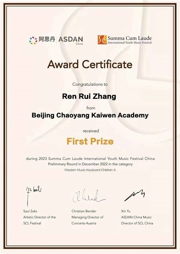 報喜2023 新年伊始,朝陽凱文的同學們在音樂、數(shù)學、化學三項賽事中嶄露頭角,收獲滿滿,喜報連連!三項重磅獎項分別是: 維也納國際青少年音樂節(jié)一等獎 美國少年化學家趣味活動優(yōu)秀獎 北美數(shù)學聯(lián)盟競賽2金5銅 在朝陽凱文,學校一直鼓勵并帶領同學們參與國際競賽,讓競賽不再是尖子生的專屬,而是每一位孩子都可以參與其中,充分發(fā)揮他們的興趣特長,在不同的領域發(fā)光發(fā)熱,收獲自信和成長。 今天,就讓我們一起看看凱文小將們在2023年,收獲了哪些驚喜吧! 維也納國際青少年音樂節(jié)一等獎 朝陽凱文3年級張壬睿同學在2023冬季“至高榮耀”維也納國際青少年音樂節(jié)(線上雨軒站)活動中,獲得西洋樂初賽一等獎的好成績,順利進入全國總決賽,并有機會獲得2023年暑假前往維也納金色大廳的演出機會!