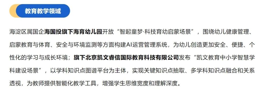 2024 年 9 月 26 日,在 2024 年北京市人工智能應(yīng)用場景聯(lián)合研發(fā)平臺發(fā)布活動暨 2024 年北京市人工智能行業(yè)大模型創(chuàng)新應(yīng)用大賽啟動儀式上,中關(guān)村科學(xué)城發(fā)布了《人工智能全景賦能首批開放場景榜單》。該榜單面向具身智能、醫(yī)藥健康、教育教學(xué)、文旅消費(fèi)等海淀區(qū)重點(diǎn)產(chǎn)業(yè)和民生領(lǐng)域。